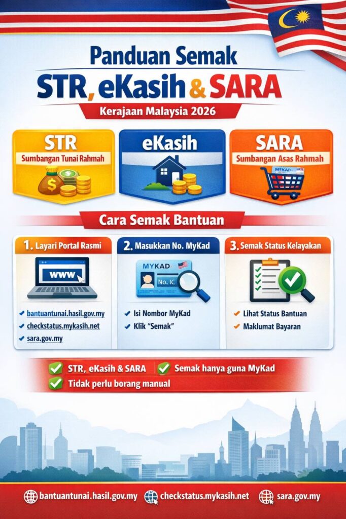 Malaysia mempunyai beberapa program bantuan penting yang memberi sokongan kepada rakyat terutamanya golongan B40, miskin dan miskin tegar. Antaranya ialah Sumbangan Tunai Rahmah (STR), eKasih dan Sumbangan Asas Rahmah (SARA). Artikel ini akan bantu anda faham apa setiap program ini, siapa layak, dan bagaimana nak semak status kelayakan secara online.